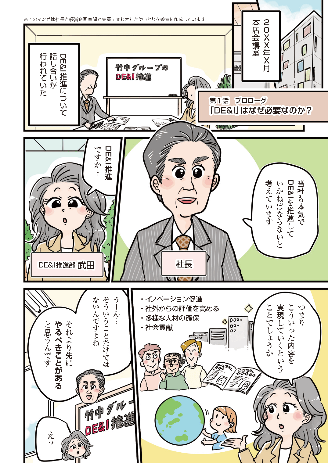 また、何気ない雑談の中からさまざまなアイデアを出してくださいました。第5話で「ストーリーの終盤に読者への問いかけを入れる」案も、そんなところから生まれました。いまや社内でもDE&Iといえばマンガ、という認識になっています。それほど浸透したのは、やはりマンガだからこそなのではないでしょうか。